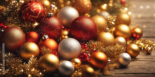 Christmas illustration with various holiday symbols: red and golden balls, Christmas tree branches, decorations. Generative AI