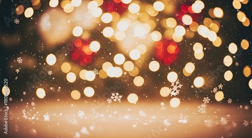Christmas lights and snowflakes falling against a dark background.