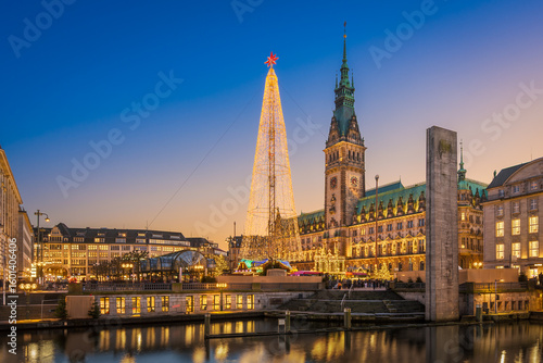Christmas market and Christmas tree in front of the Town Hall in Hamburg, Germany