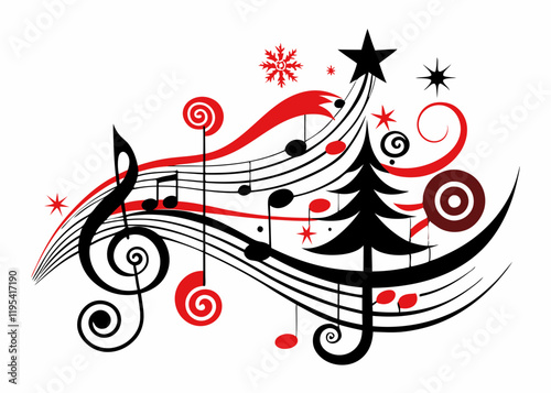 Christmas Music with Musical Notes, Treble Clef, and Stylized Christmas Tree in Festive Design