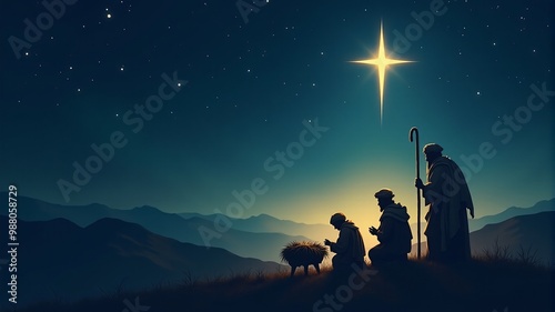 Christmas Nativity Scene. The Shepherds visiting baby Jesus Christ in the Manger, A peaceful scene with shepherds kneeling before the manger, with the Star of Bethlehem shining above.