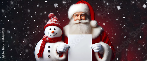 Christmas. New Year. Santa Claus is smiling and holding a white blank sheet for your text. Snowman. Banner. created by AI