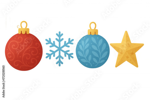 Christmas ornaments collection, featuring red and blue baubles, snowflake, and golden star, transparent background