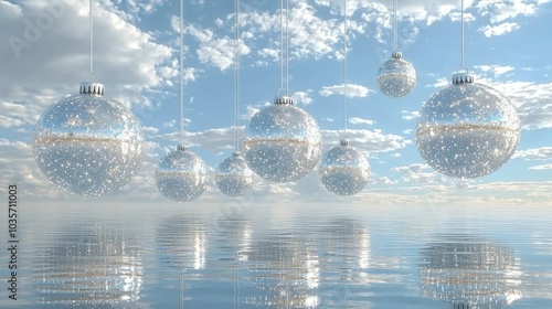 Christmas Ornaments Hanging Over Water with Blue Sky and Clouds