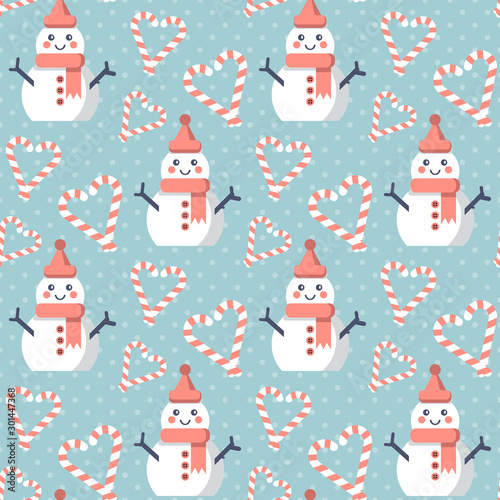 Christmas pattern. Seamless vector illustration with snowman and heart-shaped candies