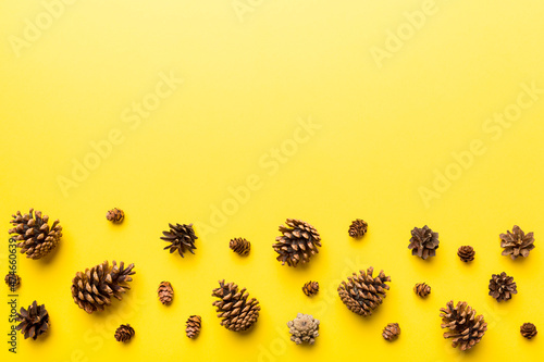 Christmas pine cones on colored paper border composition. Christmas, New Year, winter concept. Flat lay, top view, copy space