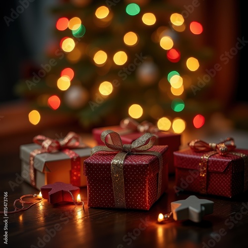 Christmas Presents Festive Lights on Dark Wood Table