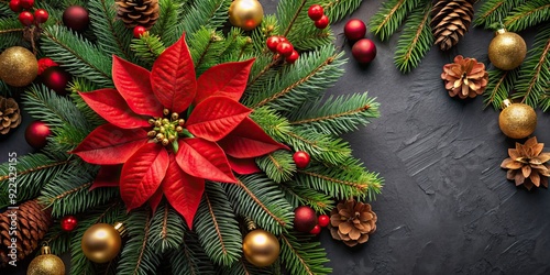 Christmas red poinsettia flower surrounded by fir tree branches, berry twigs