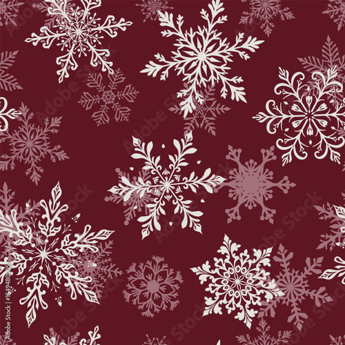 Christmas seamless pattern with two layers of large intricate snowflakes in various designs, white on red background.