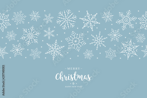 Christmas snowflake elements border card with greeting text seamless pattern ice blue background.