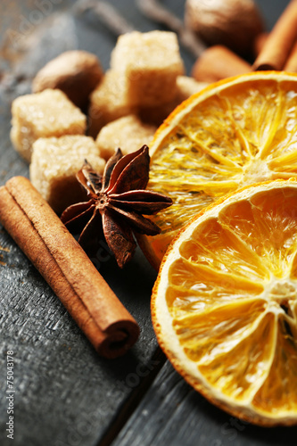 Christmas spices and baking ingredients on wooden background