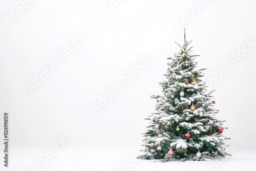 Christmas tree adorned with ornaments and snow on a white background