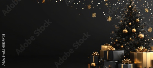 Christmas Tree and Presents on Black Background.