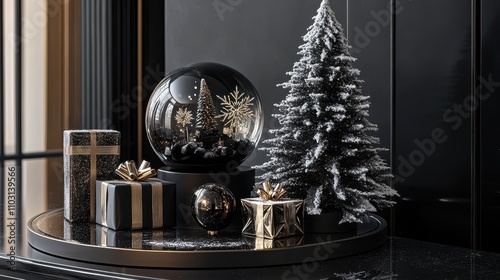 Christmas tree in Glass snow globe on black background, Christmas decorative design with white snowdrift,snowflakes,glow garland,3d decorative garland glow.Xmas Decorations,Vector illustration.