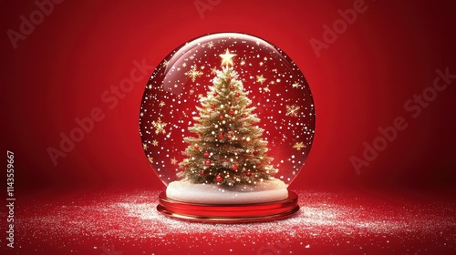 Christmas tree in Glass snow globe on red background, Christmas decorative design with white snowdrift,snowflakes,glow garland,3d decorative garland glow.Xmas Decorations,Vector illustration.