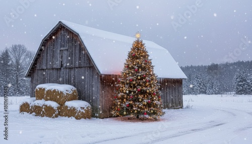 Christmas tree outdoors near a wooden barn with snow-covered roof, hay bales, and a calm winter landscape