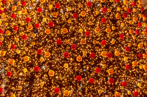 Christmas tree with dark background glowing lights. Multicolored lights decorations as background.