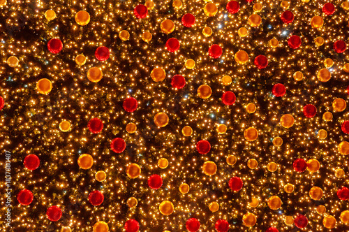 Christmas tree with dark background glowing lights. Multicolored lights decorations as background.