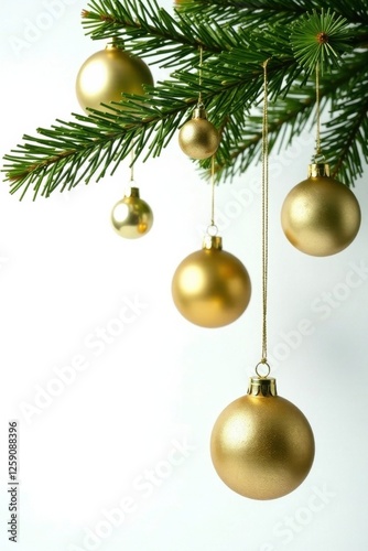 Christmas tree with gold ornaments hanging from branches, isolated on white background, Isolated object, Holiday decor, White background