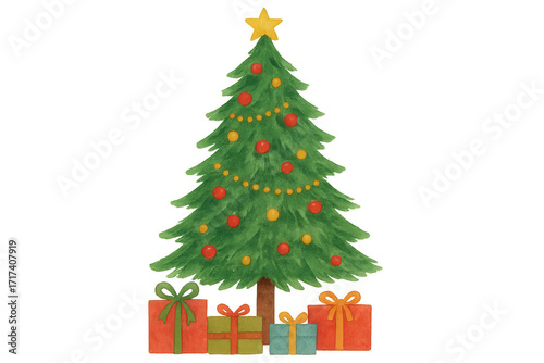 Christmas tree with star, ornaments, and gifts, celebrating winter holidays and festive season in watercolor