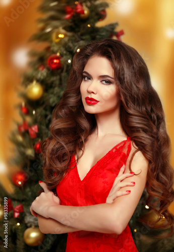 Christmas woman. Beautiful smiling girl model. Makeup. Healthy l