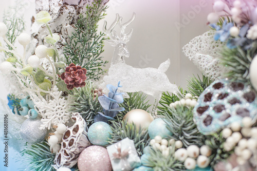 Christmas wreath in blue with a toy deer. Christmas card with deer in white and blue. Christmas composition with different balls, gifts on other toys
