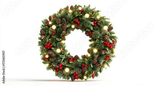 Christmas wreath of evergreen pine needles, red berries, rustic pine cones and warm glowing lights on clean white background, festive seasonal decoration for holidays