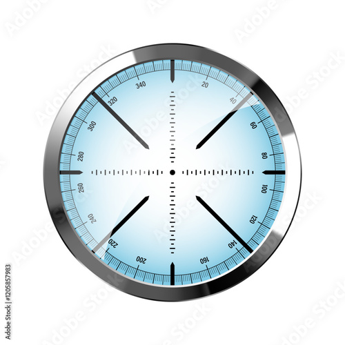 Chrome weapon sight, sniper rifle optical scope. Hunting gun viewfinder with crosshair. Aim, shooting mark symbol. Military target sign, silhouette. Game interface UI element. Vector illustration