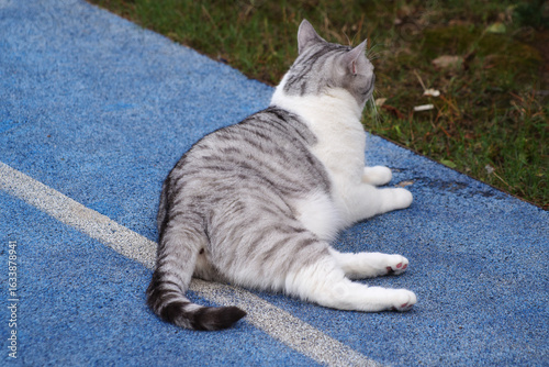 Chubby American Shorthair Cat Lying on a Blue Track Outdoors