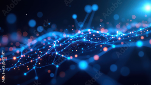 Ci/CD, Kubernetes, and Docker visualized with a network of interconnected nodes and lines in blue and white colors, representing DevOps concepts.