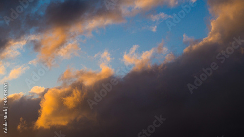 Ciel aux couleurs nacrées, pendant le coucher du soleil. Les reflets du soleil sous ces petits cumulus confèrent une teinte sublime à ces nuages
