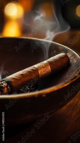 Cigar resting in ashtray with smoke trail