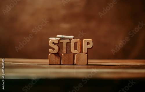 Cigarette fragments spelling stop on wooden blocks, symbolizing tobacco harm and lung cancer prevention message