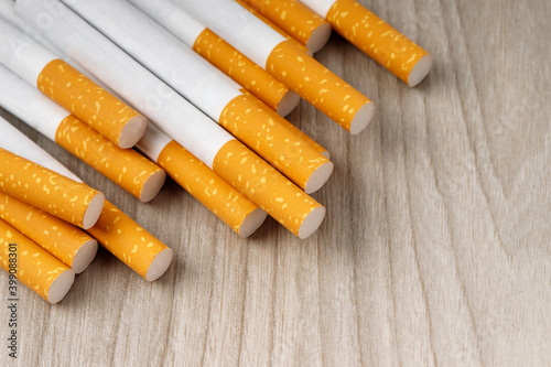 cigarettes. pile on wooden background. image of several commercially made or Non smoking campaign concept, tobacco.