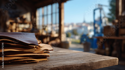 Cinematic close-up of a stack of vegetable-tanned leather sheets on a wooden table, soft light streaming from tall workshop windows, blurred industrial workshop in background, text