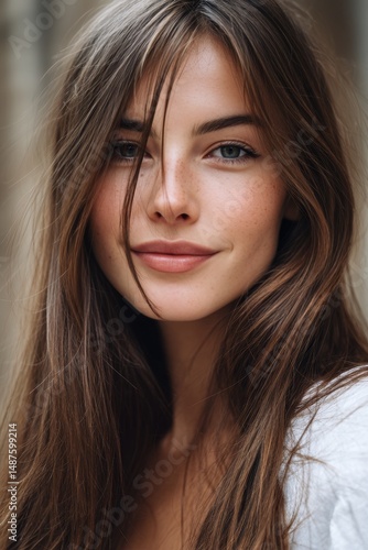 Cinematic close-up portrait of a beautiful woman with long brown hair in soft outdoor lighting