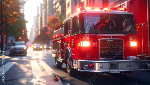 Cinematic wide-angle photorealistic shot of fire truck alarm siren flashing red, urban street background, high-resolution reflections, dramatic emergency lighting, professional realism.