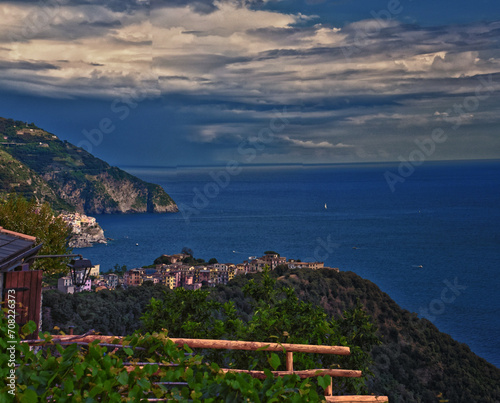 Cinque Terre Mediterranean Sea views along town hiking trail Italian Riviera coastline. Liguria, Italy, Europe. 2023 Summer.