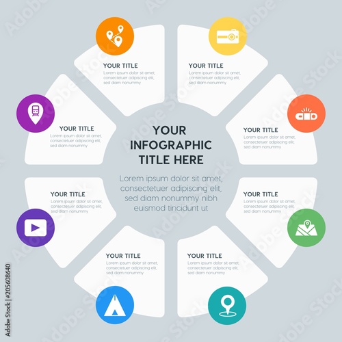 Circle chart location, security, video, photos infographic template with 8 options for presentations, advertising, annual reports