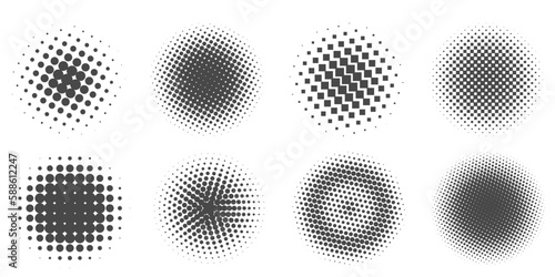 Circle dots with halftone pattern. Round gradient background. Elements with gradation points texture. Abstract geometric shapes. Vector set