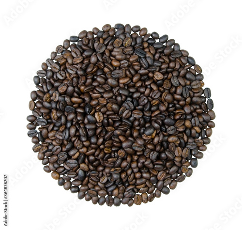Circle of coffee beans isolated on a white background. Dark roasting.