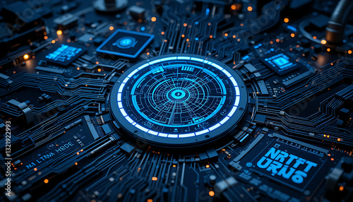 Circuit Board with Glowing Digital Interface and Cybernetic Elements