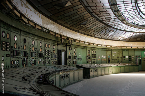Circular industrial hall with glass dome ceiling and control panels - Kelenföld Power Plant