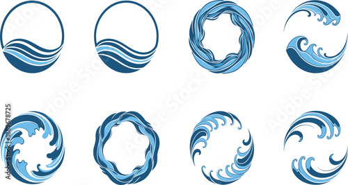 Circular Ocean Wave Logo Vector Set with Abstract Water Frames and Swirl Symbols for Surf Branding Coastal Businesses and Modern Graphic Design Projects