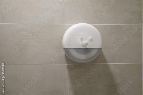 Circular toilet paper dispenser mounted on tiles.