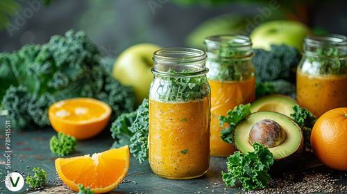 "Nutrient-rich orange and kale smoothie in a mason jar, surrounded by fresh greens and avocado, offering a healthful boost."