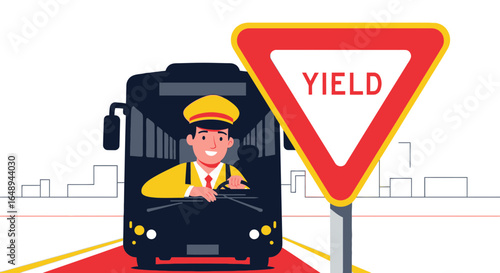 City Bus Driver Approaching A Yield Sign In Traffic Illustration Vector