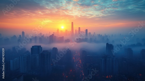 City skyline at sunrise with fog and skyscrapers