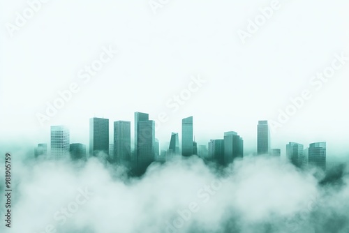 City skyline emerging from fog, serene atmosphere, minimalist design.