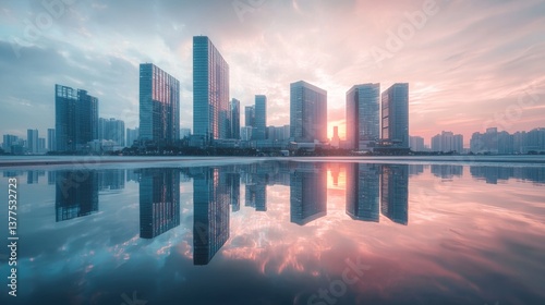 City skyline reflects in calm water at sunset with vibrant colors lighting the buildings